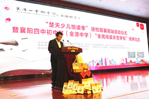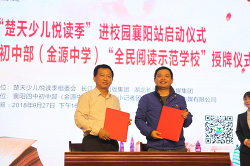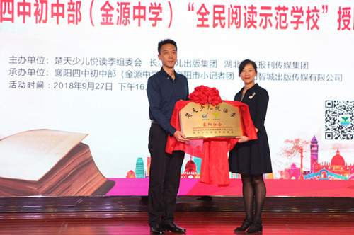 “縱有千古,橫有八荒。前途似海,來日方長。美哉我少年中國,與天不老!壯哉我中國少年,與國無疆!”9月27日下午,在數百名學子齊誦《少年中國說》的瑯瑯讀書聲中,“楚天少兒悅讀季”進校園襄陽站啟動儀式暨全民閱讀示范學校授牌儀式在襄陽四中初中部(金源中學)舉行。這也是楚天少兒悅讀季活動開展五年來授予襄陽地區的第一塊“全民閱讀示范學校”牌匾,標志著“楚天少兒悅讀季”全民閱讀活動在“千古帝鄉,智慧襄陽”開花結果。