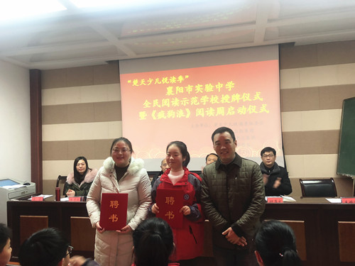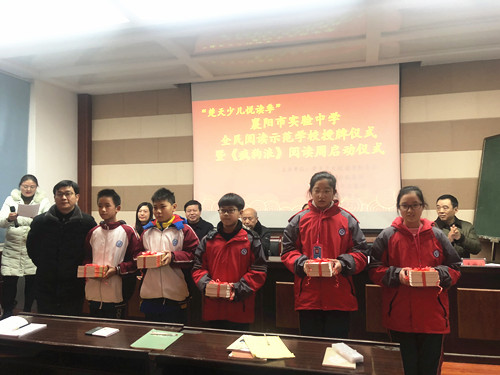郝禮明、陳棟分別向襄陽市實驗中學授牌頒證,郝禮明表示,他對襄陽市實驗中學能夠成為全民閱讀示范學校表示充分肯定。他強調襄陽市實驗中學要以此次授牌為契機,堅持打造書香校園的理念和方向,嚴格要求自己,長效發揮全民示范閱讀的引領作用。