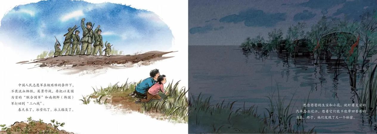 如《鴨綠江北岸》用靈動水彩繪制。翻開書,色彩輕盈,帶著江畔水汽。畫家暈染江水,藍綠相映,色彩過渡自然,人物形象親切溫暖,孩子讀來如臨其境,感受抗美援朝期間我國大后方人民的淳樸與無私奉獻。
