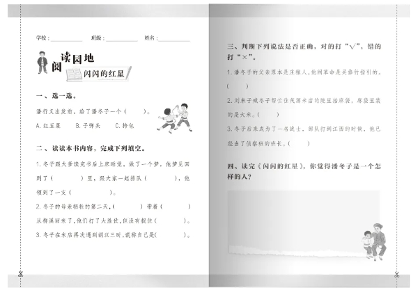 “閱讀園地”板塊:提供整本書閱讀效果檢測方法和自主閱讀指導。這既方便老師開展閱讀測驗,又能讓孩子發揮主觀能動性,在自主學習中體會紅色精神。