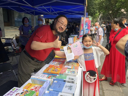長少社的首場“練攤”恰逢端午節(jié)當(dāng)天,特別邀請到著名作家“大胡子叔叔”董宏猷,為我社精品圖書現(xiàn)場帶貨。董老師的到來,帶動(dòng)了全場氣氛,引得讀者紛紛在我社攤位前駐足,挑選心儀的圖書。