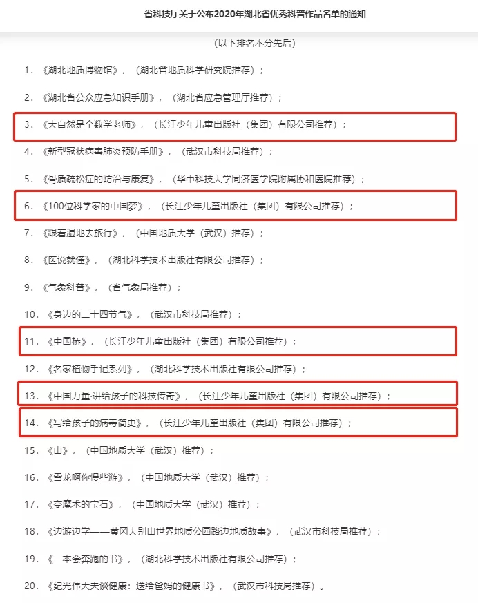 為調(diào)動和激發(fā)社會各界科普創(chuàng)作活力,在全社會大力普及科學知識,提升公眾科學文化素養(yǎng),湖北省科學技術(shù)廳組織開展了“2020年優(yōu)秀科普作品評選推薦工作”。此次活動共收到31部具有較強的科學性、知識性、藝術(shù)性、通俗性、趣味性的作品。經(jīng)單位初審、形式審查、專家評價、網(wǎng)上公示,最終評選出20部作品為2020年湖北省優(yōu)秀科普圖書作品,并向全社會廣泛推介。其中,長少社《大自然是個數(shù)學老師》《100位科學家的中國夢》《中國橋》《中國力量系列》《寫給孩子的病毒簡史》共計5種優(yōu)秀圖書入選。