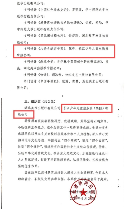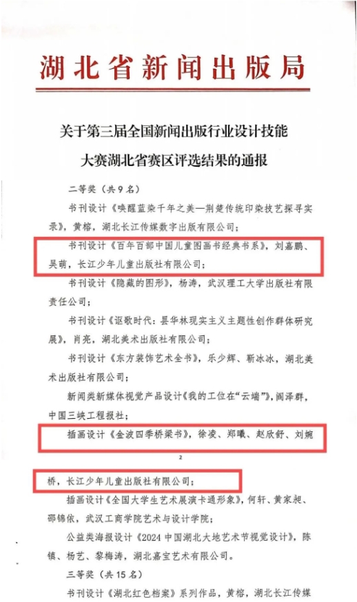 其中,長江少年兒童出版社出版的《百年百部中國兒童圖畫書經(jīng)典書系》《金波四季橋梁書》榮獲職工組二等獎,《八條古道游中國》榮獲職工組三等獎,長江少年兒童出版社(集團)有限公司榮獲組織獎。
