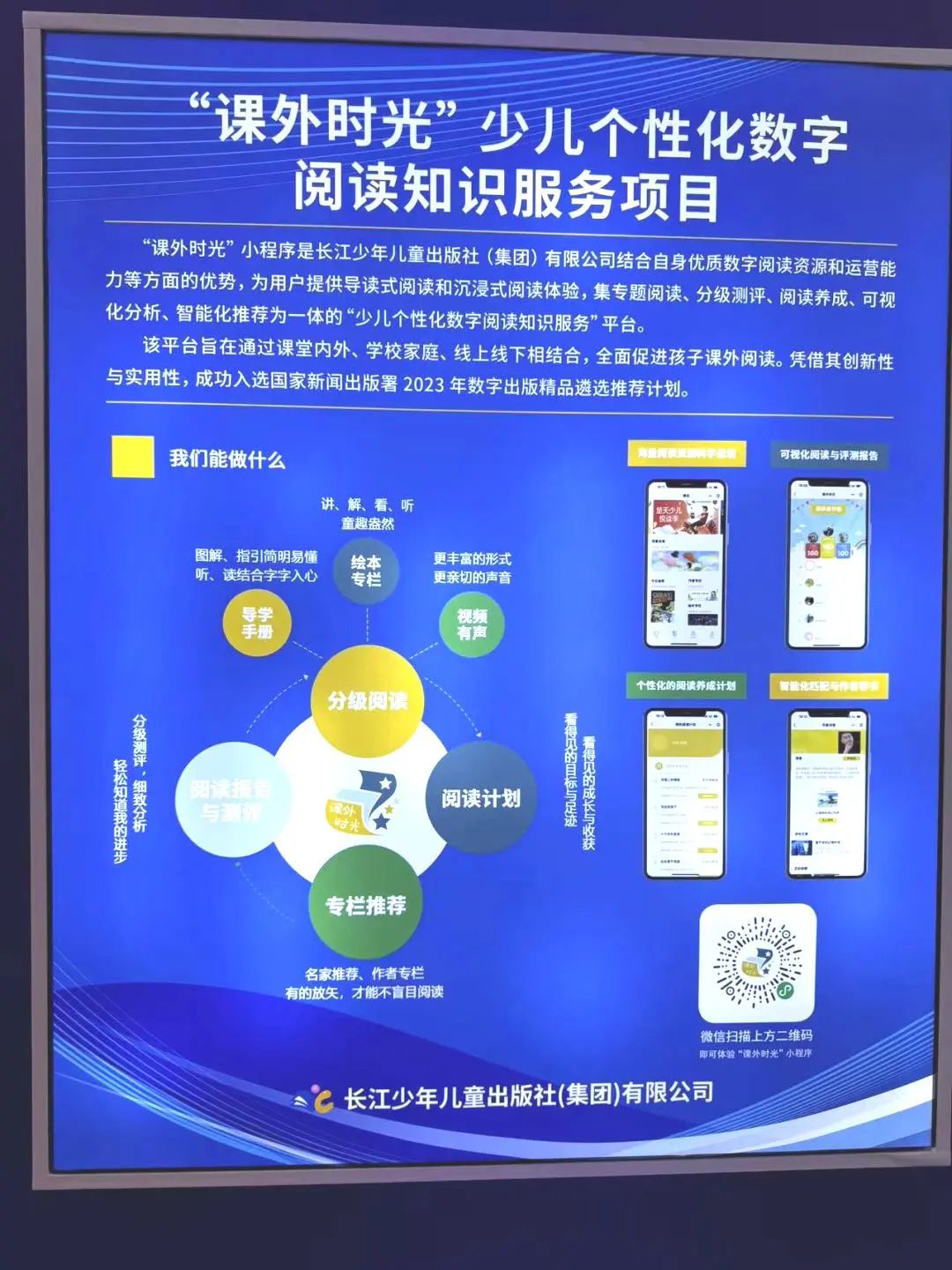 長江少年兒童出版社(集團)作為參展單位之一,攜帶眾多創新數字產品精彩亮相。長少集團在此次數博會上,重點展示了“課外時光”小程序和“百年百部中國兒童圖畫書經典書系”融媒體出版項目,英語分級閱讀繪本,以及沈石溪畫本融媒體出版工程和上知天文下知地理等數字產品,吸引了眾多參觀者駐足體驗。