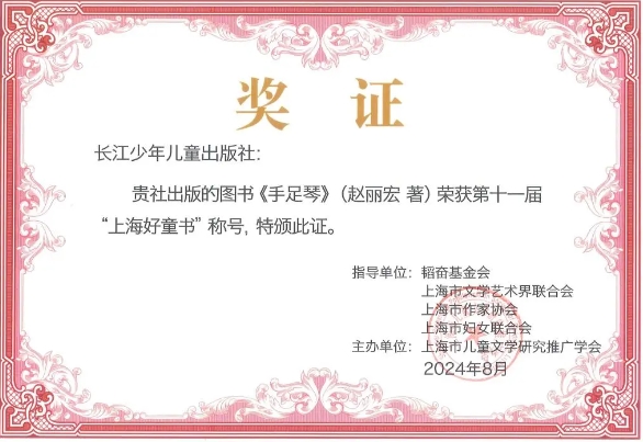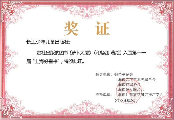2024年8月14日,由上海市兒童文學(xué)研究推廣學(xué)會(huì)主辦的第十一屆“上海好童書”頒獎(jiǎng)儀式在上海友誼會(huì)堂舉辦。長江少年兒童出版社的《手足琴》榮獲第十一屆“上海好童書”稱號,《蘿卜大廈》入圍“上海好童書”。