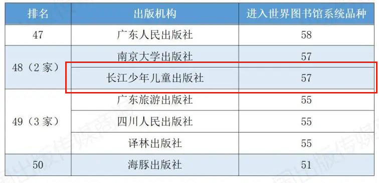 長(zhǎng)少社連續(xù)9年位列“中國(guó)圖書海外館藏影響力出版100強(qiáng)”。在最新公布的“2024年度中國(guó)圖書海外館藏影響力百?gòu)?qiáng)排行榜”中,長(zhǎng)少社排名第48位,連續(xù)3年在全國(guó)專業(yè)少兒社中居第二位。