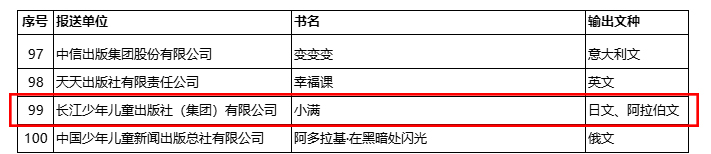 近日,中國(guó)出版協(xié)會(huì)國(guó)際合作出版工作委員會(huì)、中國(guó)新聞出版研究院、出版參考雜志社公布了第23屆輸出版優(yōu)秀圖書名單。我社圖書《小滿》(日文、阿拉伯文)成功入選。