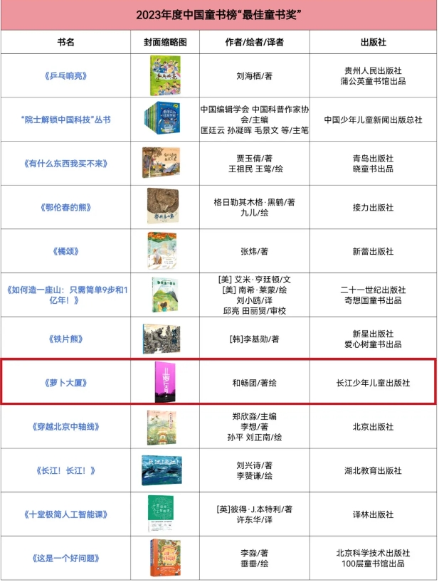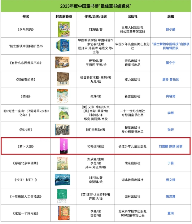2024年4月2日下午,在第58個“國際兒童圖書日”當天,第十一屆中國童書榜隆重發布,長江少年兒童出版社《蘿卜大廈》2023年度“最佳童書獎”,本書編輯劉嘉鵬、陳穎、吳萌榮獲“最佳童書編輯獎”。
