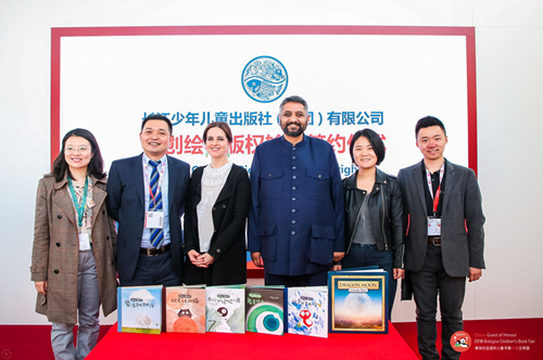 在本次博洛尼亞國際童書展上,長江少年兒童出版社分別與法國阿歇特國際出版集團和尼泊爾當代出版社現場簽約,成功向世界法語區和尼泊爾輸出了該社原創圖畫書《耳朵先生音樂繪本》和《龍月》的法語和尼泊爾語版權。出席本次活動的嘉賓有長江少年兒童出版社(集團)有限公司副總經理凌晨先生、阿歇特國際出版集團出版合作部經理馬蒂爾德·加布隆斯基女士、鳳凰阿歇特文化發展有限公司 總經理徐革非女士、尼泊爾當代出版社總裁凱蘭·高塔坶先生、《耳朵先生音樂繪本》系列圖書插畫作者水母咪女士、《龍月》中國合著者陳穎先生等。